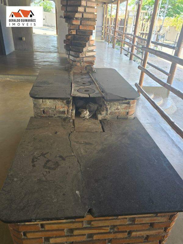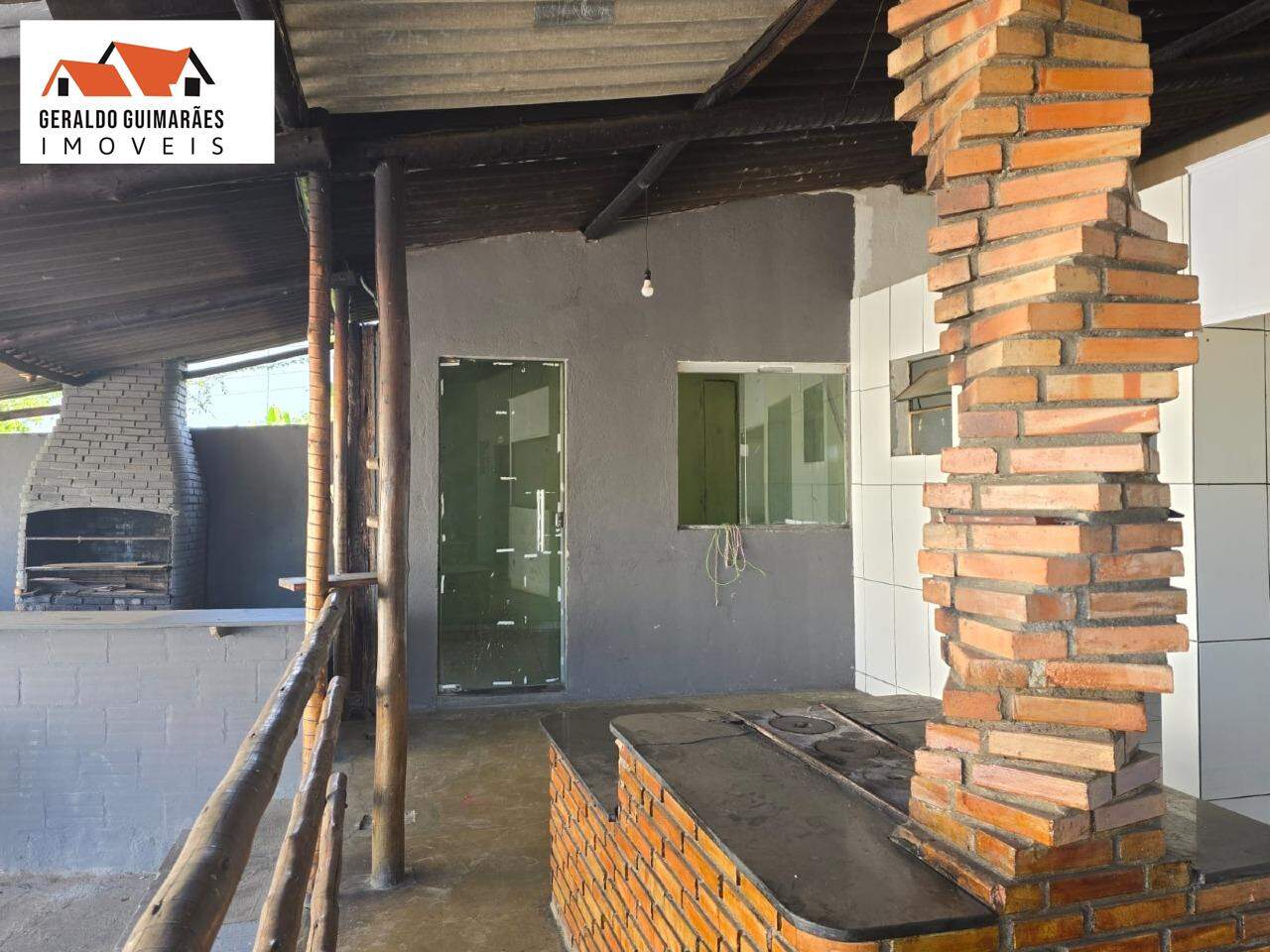 Cozinha, fogão a lenha, churrasqueira, Banheiro masculino e feminino.